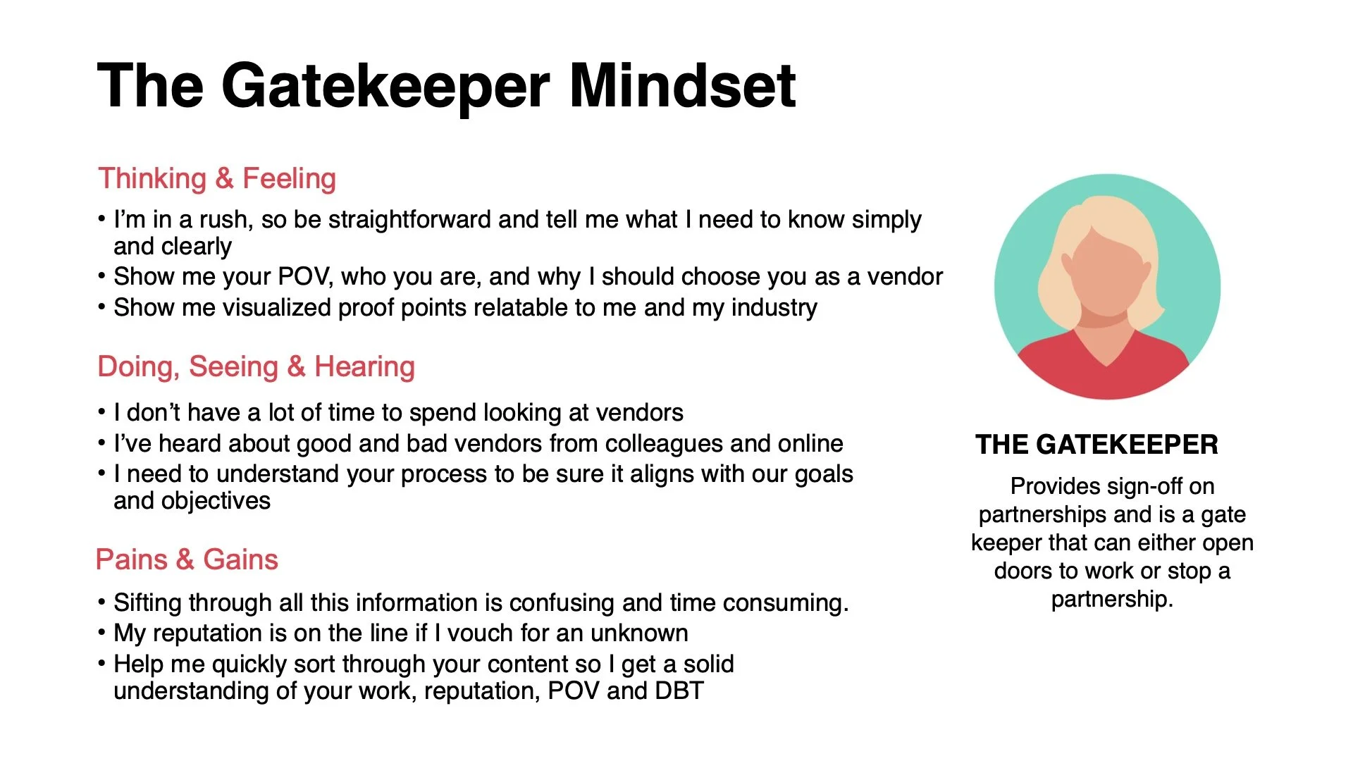 After executing the research and synthesizing the results we were able to distinguish 3 different personas with different mindsets and needs. “The Advocate”, “The Gatekeeper” and The Researcher”
