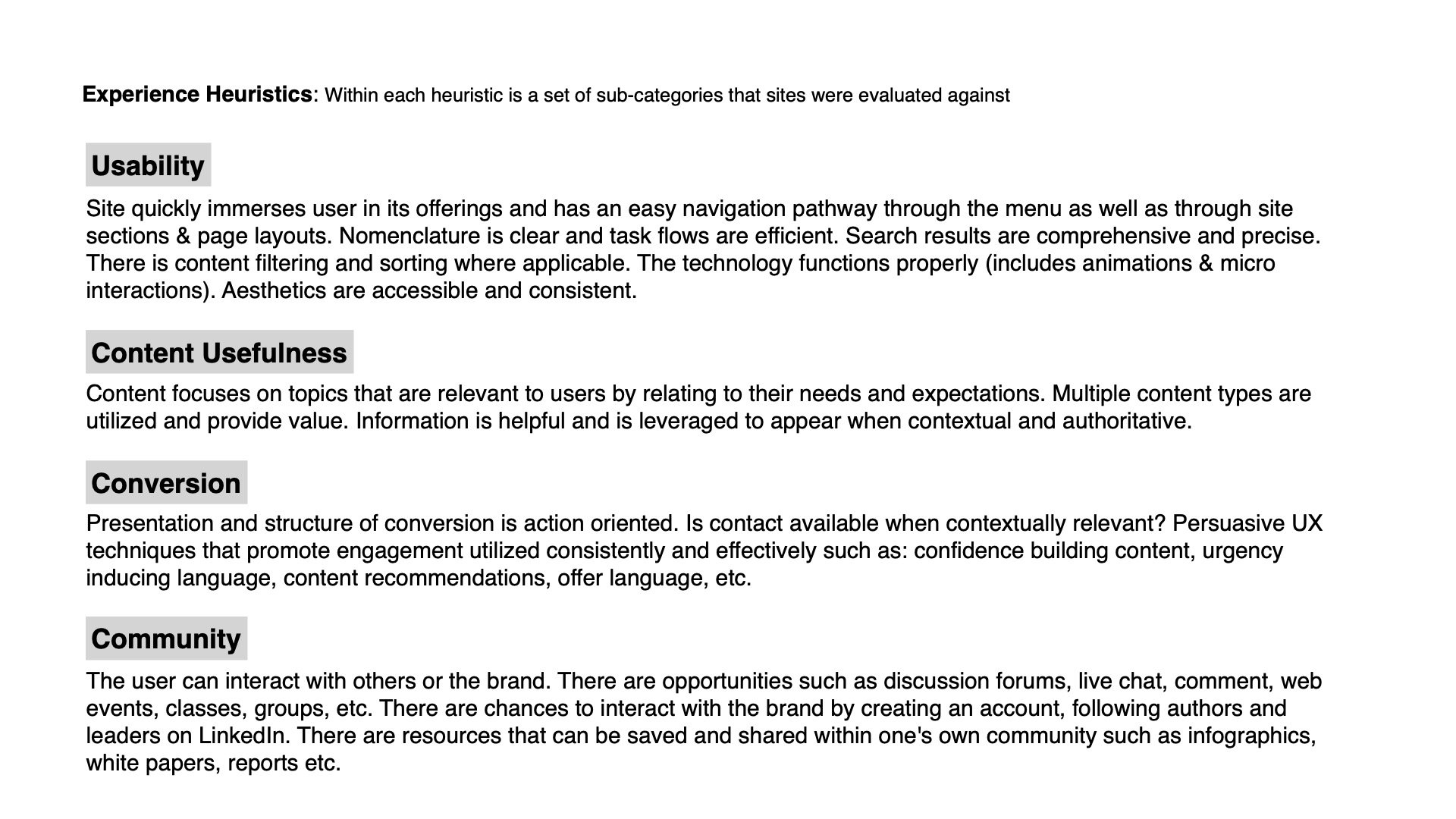 Next my team and I reviewed our website ux alongside 5 of our competitors against a set of heuristics that aligned with our business goals. The outcomes were interesting in that while there are a few competitors winning in making their site usable (focusing on general usability) all struggled with content usefulness + organization, conversion and community. This gave us some white space to consider when differentiating ourselves from the competition.