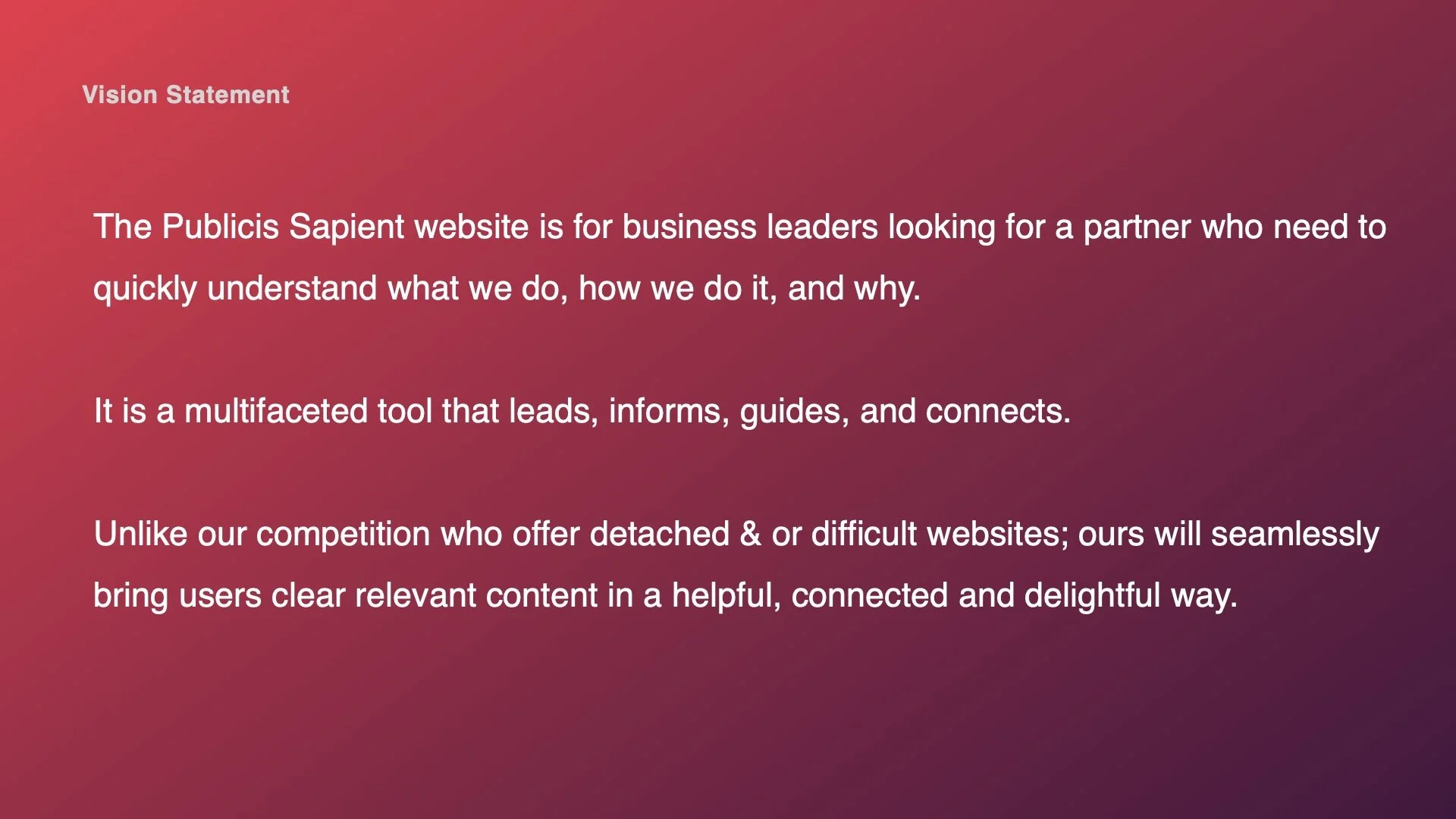 Now that we had a grasp on what was currently happening internally with the website and with our competition, I planned and executed a remote qualitative user research study to give us an outside in perspective. We recruited 30 business decision makers who fit our target audience. Half of the participants knew of Publicis Sapient half did not. We had 30 minute 1 on 1 discussions with them around what steps they take when researching, recommending and ultimately choosing a digital consulting agency. Then we recruited 30 more business decision makers with the same target audience criteria for remote usability study of our website experience.
